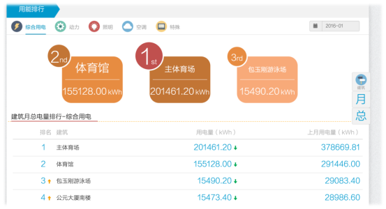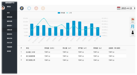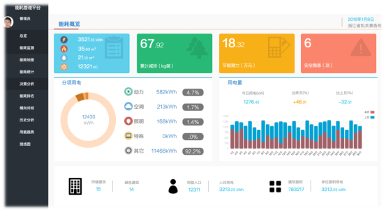 對整個監(jiān)控區(qū)域及其各個建筑的能耗情況進行統(tǒng)計分析,通過分析總能耗、分項用電、人均用能、單位面積用能、無效能耗等指標,找出建筑中可能存在用能浪費的環(huán)節(jié);
